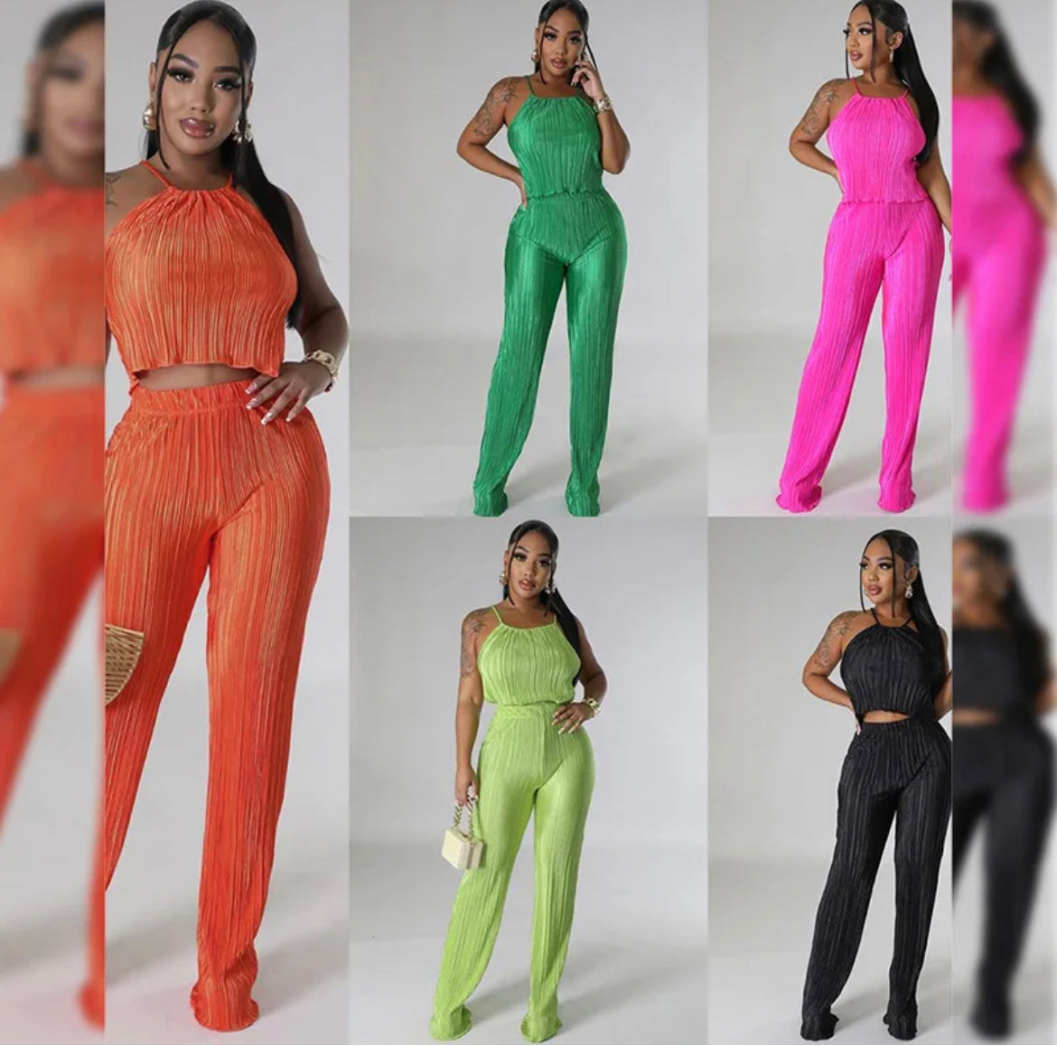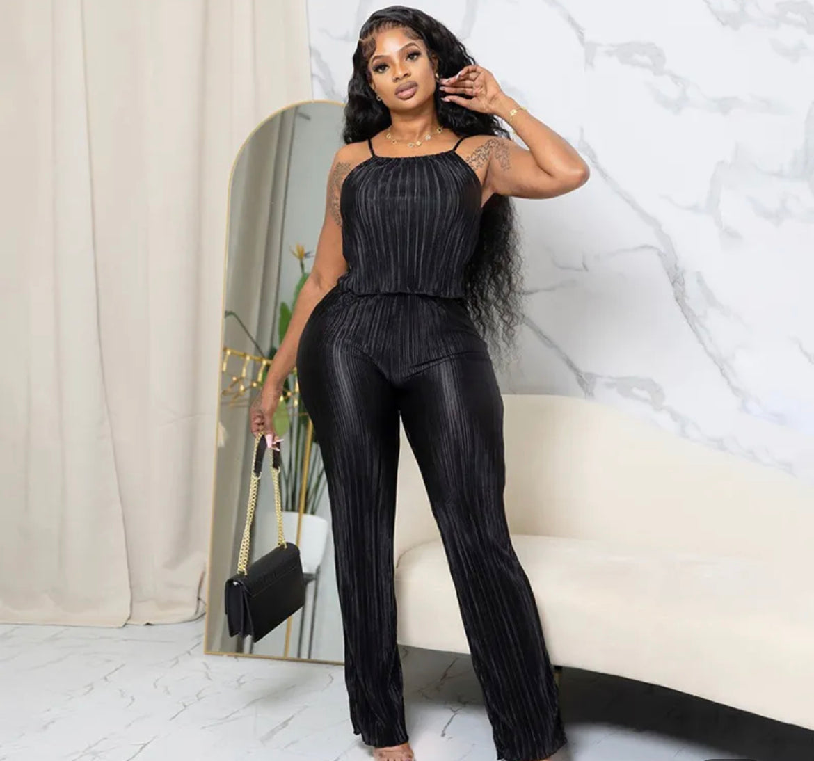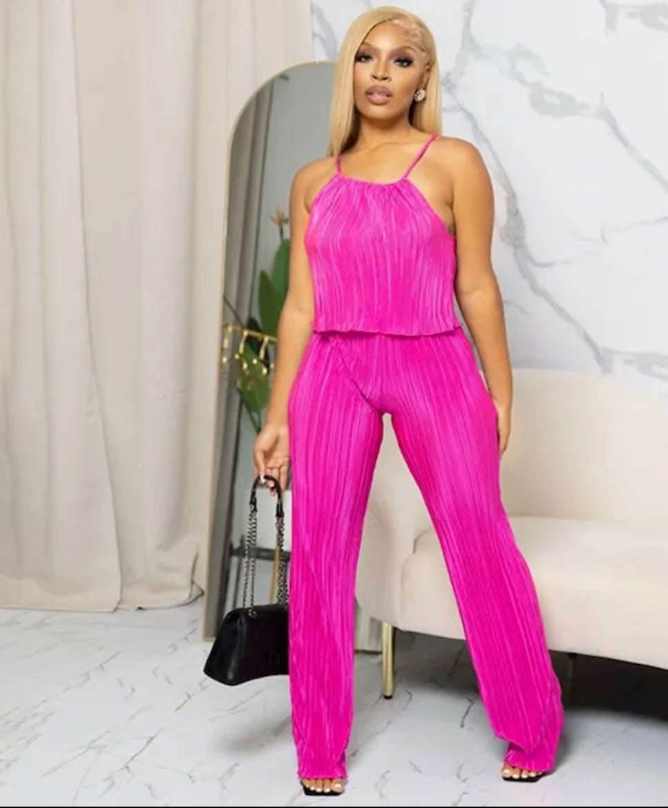 Two piece pleated tank top with pants. Loosefitting and stretchy. True to size.